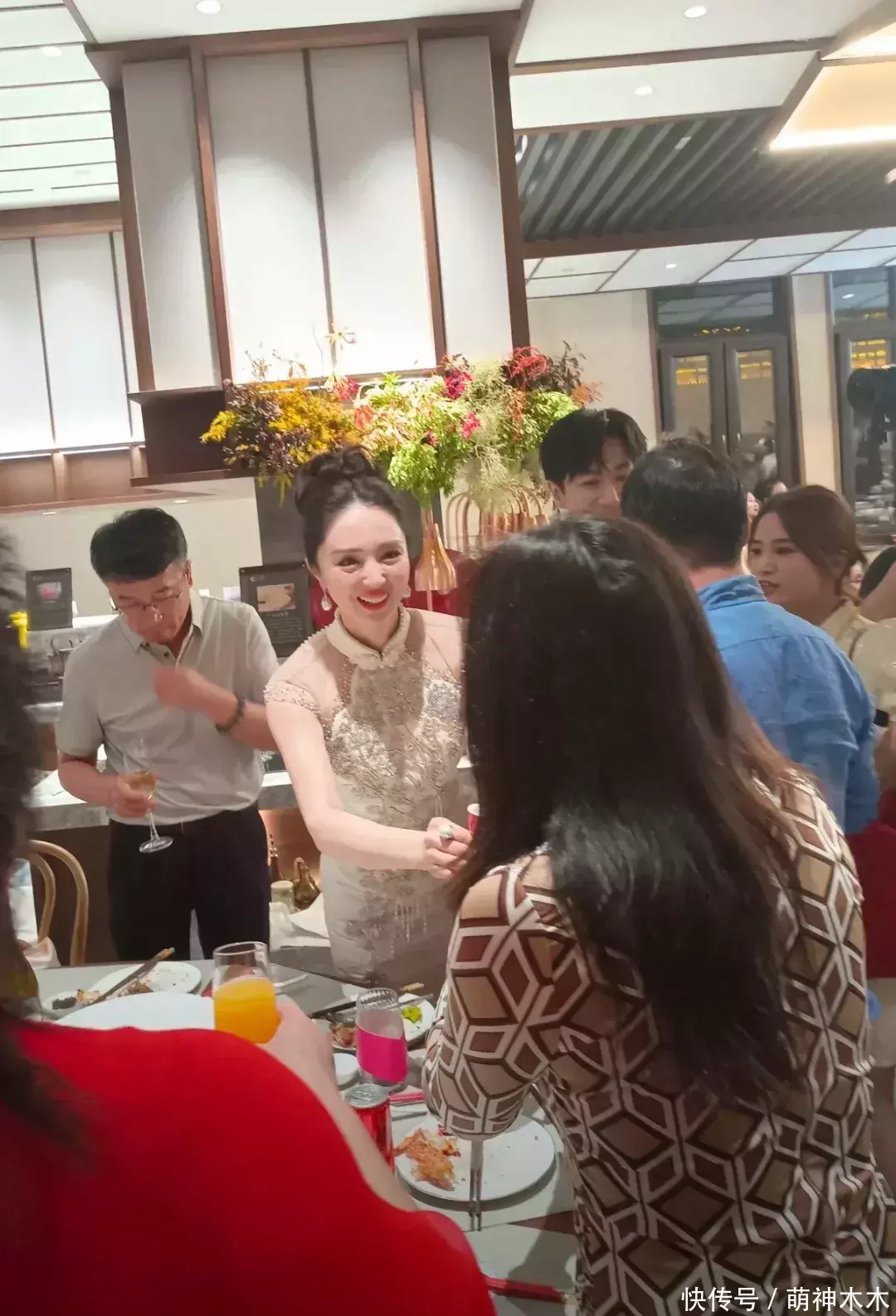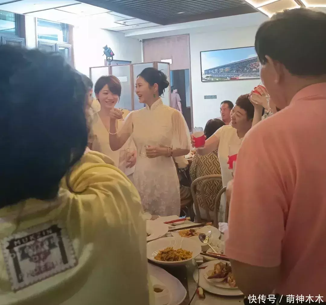 除了董璇夫妇,婚宴现场还有董璇的明星好友关悦,她也身穿一件中式旗袍跟大家愉快的敬酒,看周围人脸上的表情,喝得很愉快。在这个画面当中,可以看到董璇婚宴现场还是较为朴实,背景中出现的亲朋好友都穿着朴素,座位也比较拥挤,有一种朴实感,跟大多普通人的婚姻一样接地气。