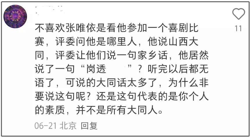 另外,张维伊婚讯被曝光后,外界就在被动认识这位喜剧人,黑历史也陆续被翻出。据悉,其在录制喜剧节目时,评委让他根据大同方言表演一段,他在作品中把大同方言脏话当作梗讲了出来,直接冒犯了大同本地人,纷纷斥责他素质低下。而目前流传的网络片段脏话已被消音,不知播出时工作人员是否没听出来。